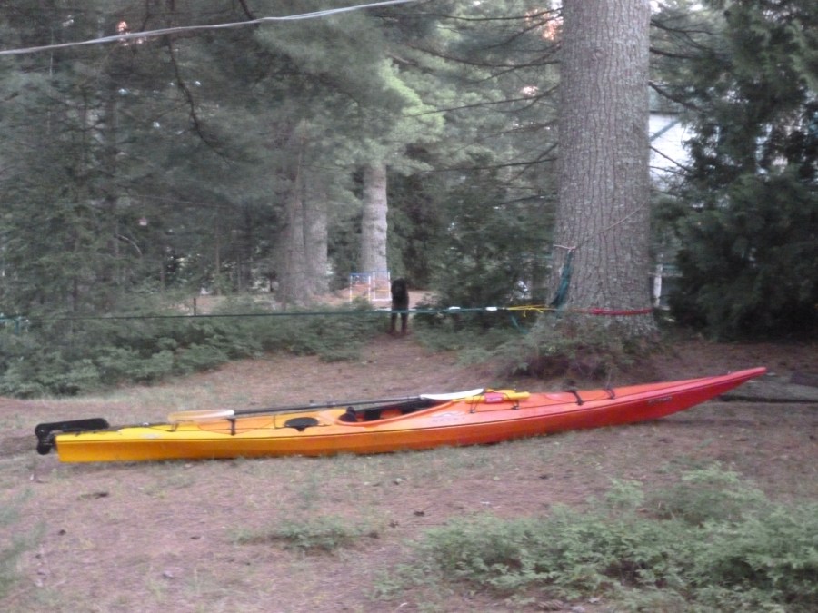 Several things of note in this one. First, my beloved kayak. One thing my photos can’t convey, though, is how much it weighs. Because it takes years for a middle schooler to save enough for a plastic sea kayak, much less a composite one, this weighs nearly 70 pounds. Here’s how you carry it solo: 1) Crouch, and grab the cockpit coaming on the far side. 2) Roll it toward you, and pick it up to knee-level (with a little bounce). 3) Vault it up to shoulder height like a barbell, then rest the inside of the cockpit (where you’re holding it) on your shoulder.