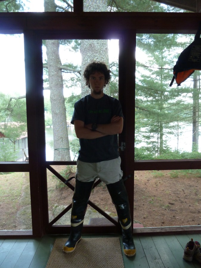 The sun shone brightly as Wyatt pulled on his fire boots and rose to his feet. “This magic rubber will shield me from the horrible creatures of the Boathouse’s murky waters,” he remarked aloud, for some reason. The boots clunked awkwardly as he made is way to the screen door. After a long and gallant struggle, he freed the door and burst through. He lunged forward as he reached the bottom of the treacherous porch steps, steadying himself against the wrinkled bark of an old pine that lay before him. Straightening his cloak, he set out to continue his heroic quest. The heavy boots made a resounding “thunk” each time he ventured a step on the deadly Stairs to the Dock. His head slowly disappeared as he descended the steps, approaching what fate lay in store for him down below, but the powerful sound of his footfall echoed throughout the forest long after he left sight. God bless that brave young soldier, and God bless his magic boots.