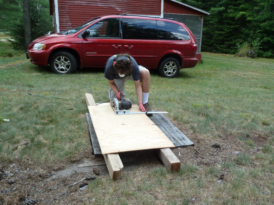 Another one of my small projects. I found this piece of plywood (dad used it as a shield last time he painted the house) and decided to make hangers for the various spars in our boathouse. I actually just got that ripping guide (the thing sticking out the side of the saw) this past weekend at the town garage sale. (Oh, that’s the other thing our town has, in addition to the single restaurant and the chapel: a garage, which the volunteer fire department calls its station.) The guide is pretty damn neat, and would have been super useful when I was cutting the fiberboard for my speakers. Oh well. Now I’m good at measuring and marking wood. =)
