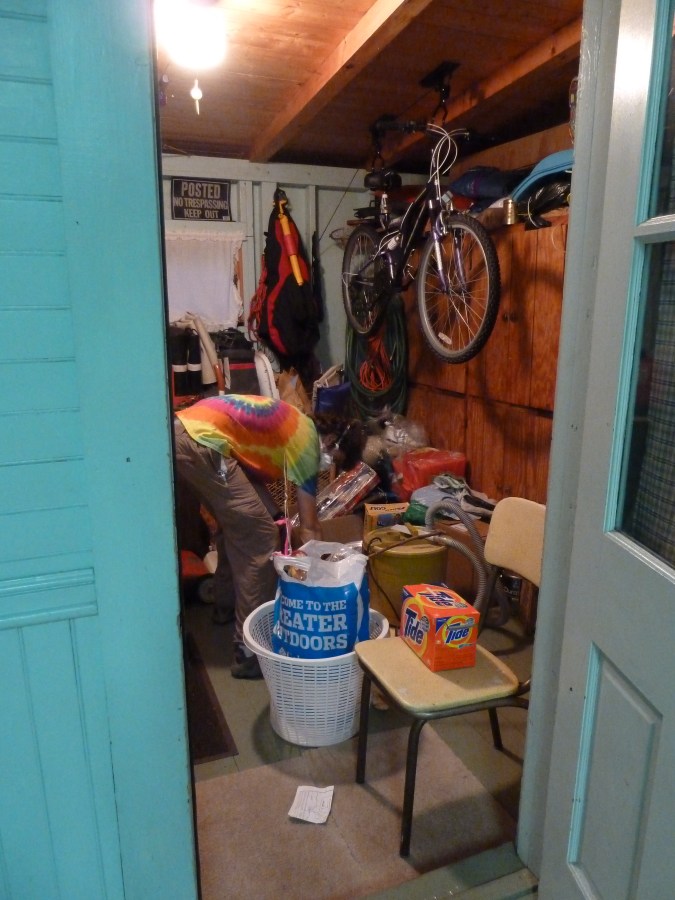 One of my other small projects was to clean out and reorganize the “mudroom” adjoining the kitchen. I’m actually mostly finished in this photo, despite the piles of stuff, but you still get the idea. Note the skillfully installed bike hanger.. 😉