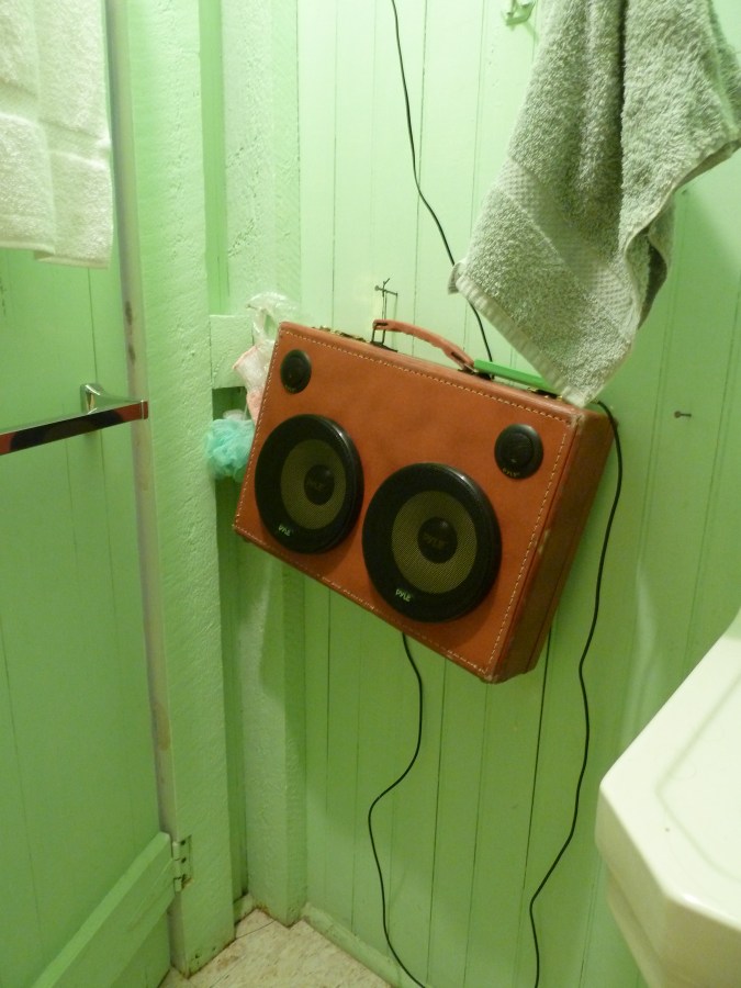 I built these a few years ago. It was before I knew how to design crossovers or bass reflex enclosures (boxes that have a tuned port tube that resonates at a frequency low enough to reinforce the low-end output of the speakers), so it’s just a set of car speakers that came with their own crossovers, paired with a 30 watt digital amplifier chip I bought online. There’s a little plate on the pack with the power and audio inputs, the indicator LED, and the volume control. I have it hanging from a nail because I wanted to listen to music while I showered and the only outlet is on the light fixture on the ceiling, so the power cable wouldn’t reach to it from the floor. (The lights and primitive electrical system were installed long after the house was built in the 1800s, and outlets are scarce).